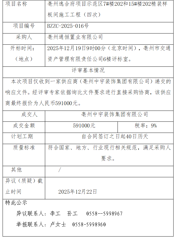 亳州逸合府項(xiàng)目示范區(qū)7#樓202和15#樓202精裝樣板間施工工程(四次)成交結(jié)果公示