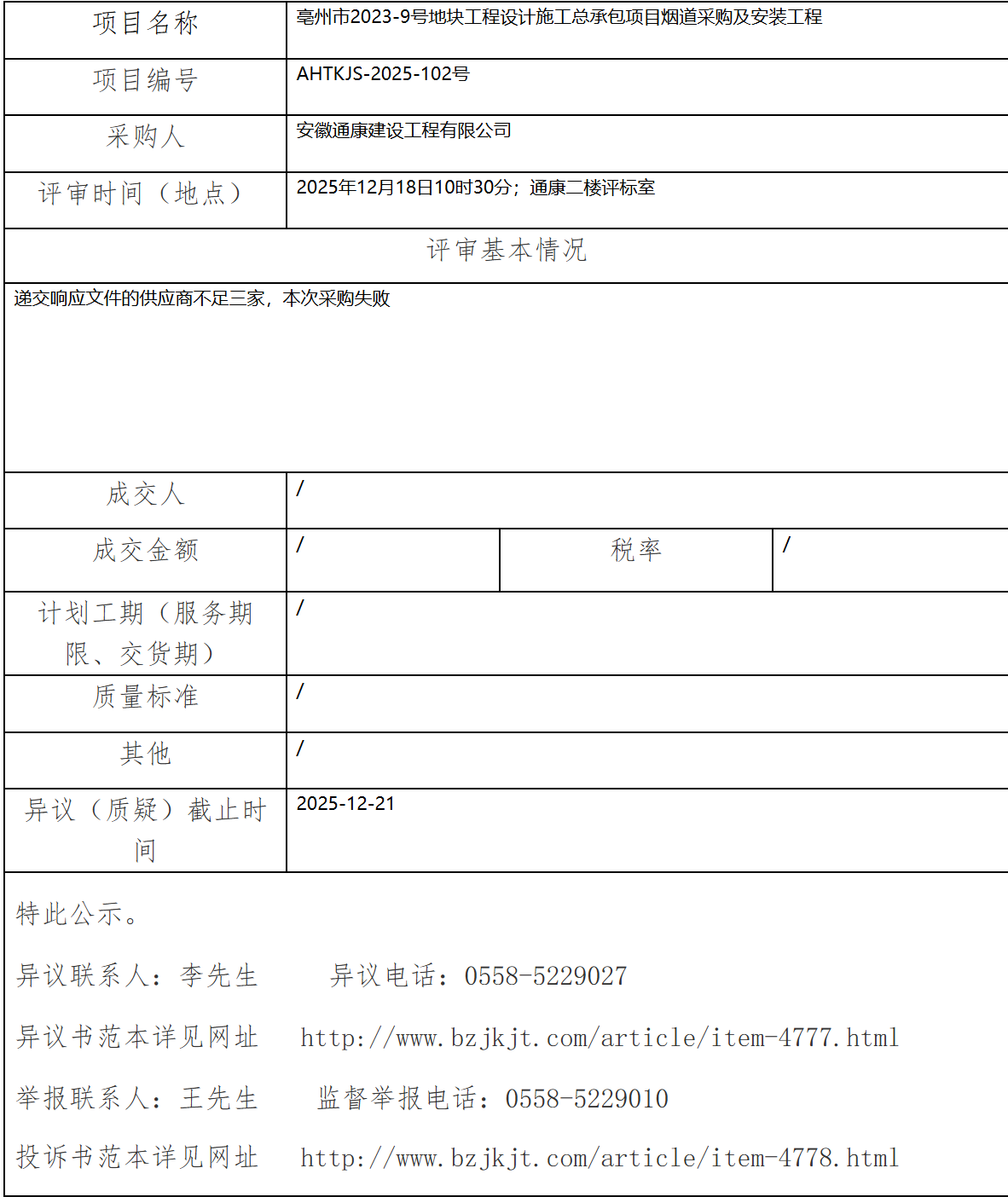 亳州市2023-9號地塊工程設計施工總承包項目煙道采購及安裝工程成交結果公示