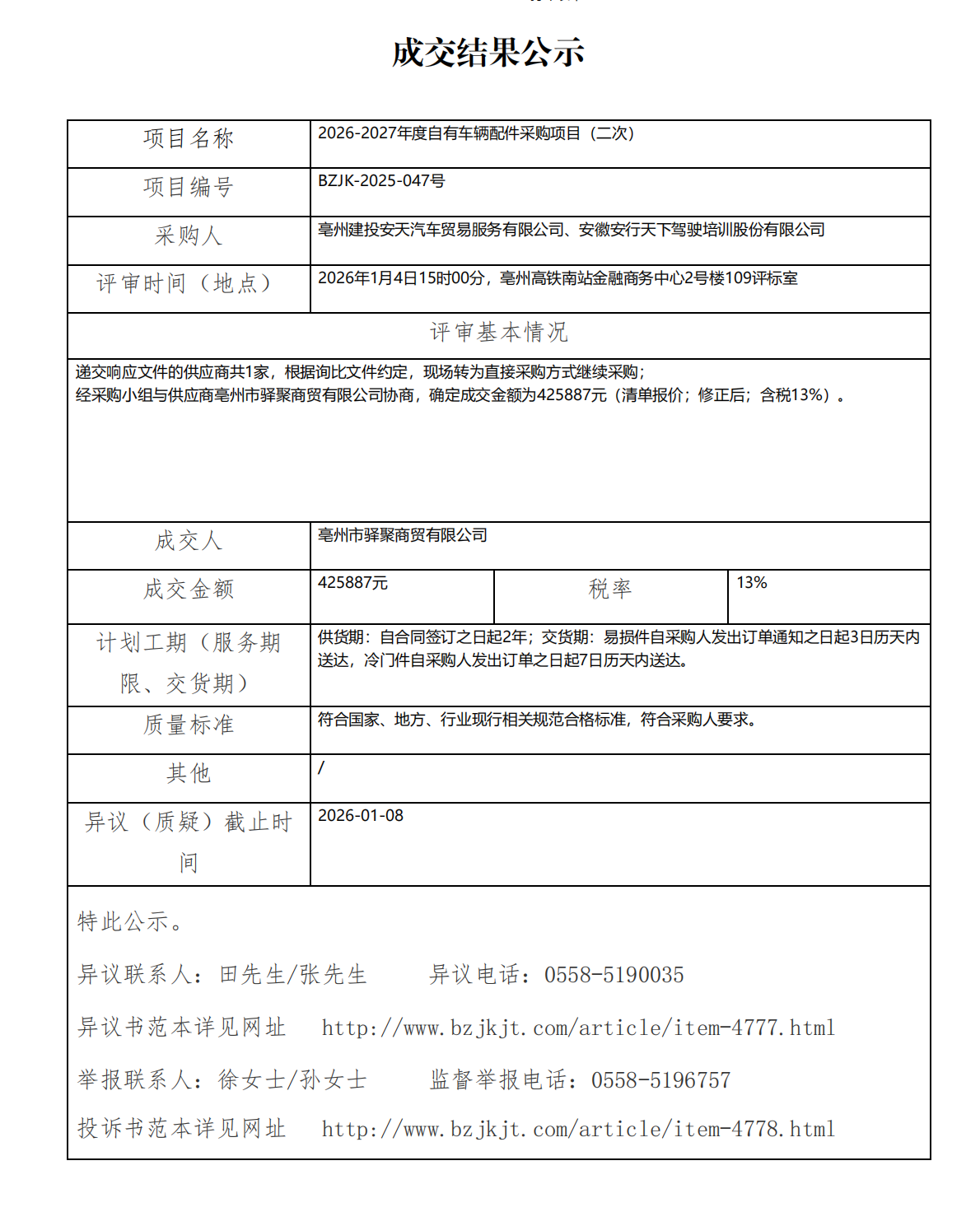 2026-2027年度自有車輛配件采購項目(二次)成交結果公示