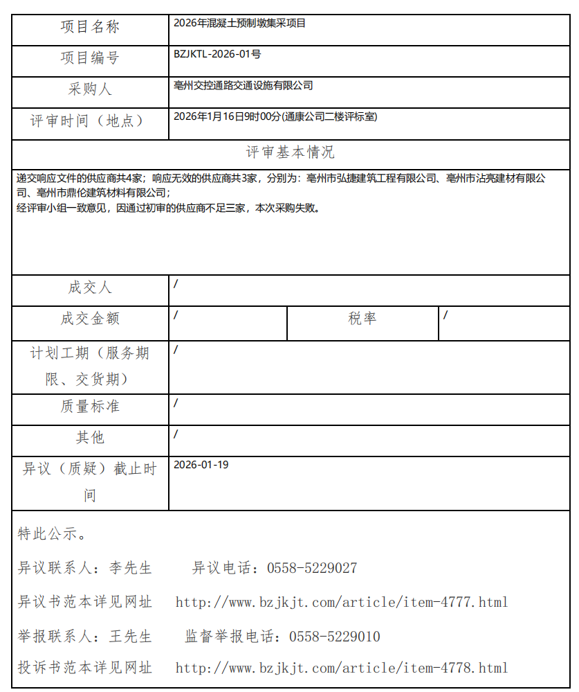 2026年混凝土預(yù)制墩集采項目成交結(jié)果公示