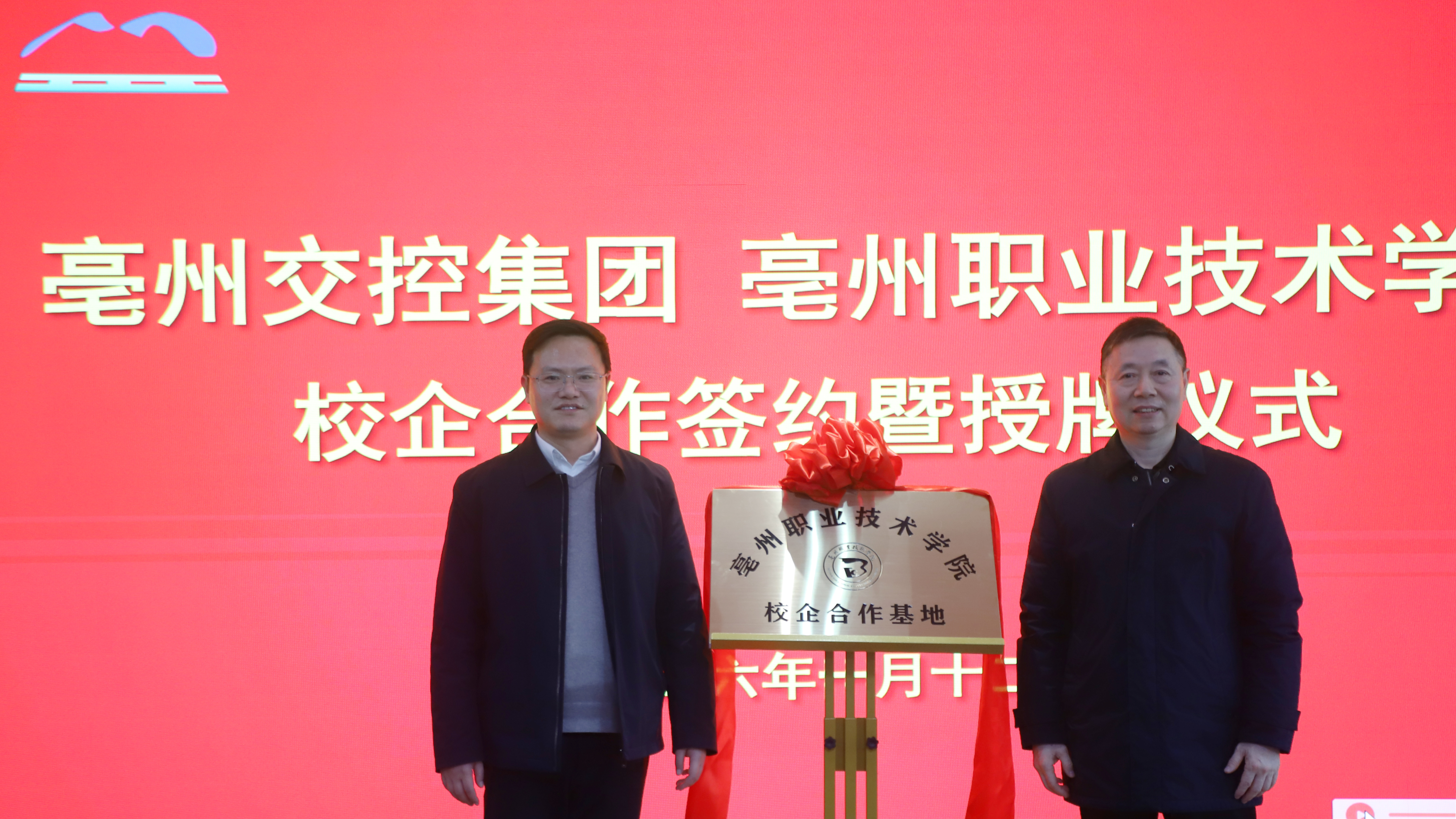在與會人員的共同見證下,亳州交控集團與亳州職業(yè)技術學院正式簽署《校企合作協議》,并為“校企合作基地”揭牌。這一儀式的完成,標志著雙方在產教融合、協同育人方面邁出堅實一步。