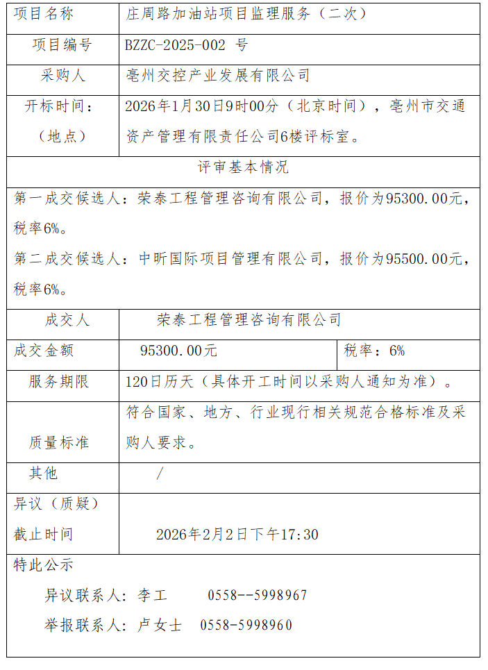 莊周路加油站項目監(jiān)理服務(二次)成交結果公示