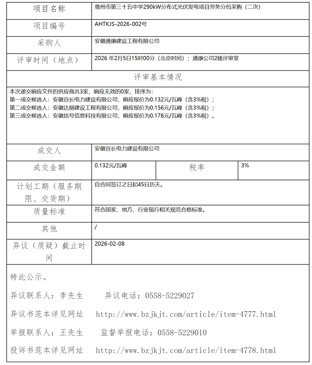亳州市第三十五中學(xué)290kW分布式光伏發(fā)電項(xiàng)目勞務(wù)分包采購(二次)成交結(jié)果公示