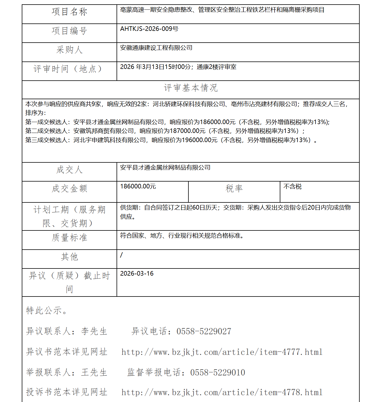 毫蒙高速一期安全隱患整改、管理區(qū)安全整治工程鐵藝欄桿和隔離柵采購項目成交結(jié)果公示