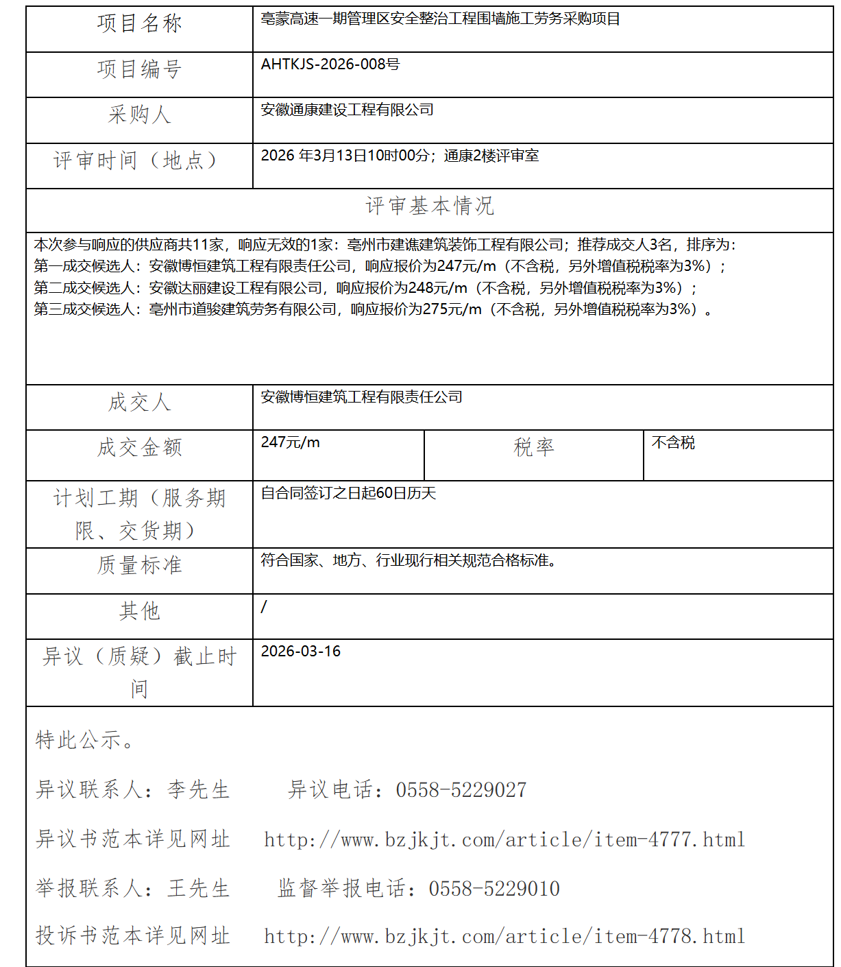 亳蒙高速一期管理區(qū)安全整治工程圍墻施工勞務(wù)采購項目成交結(jié)果公示