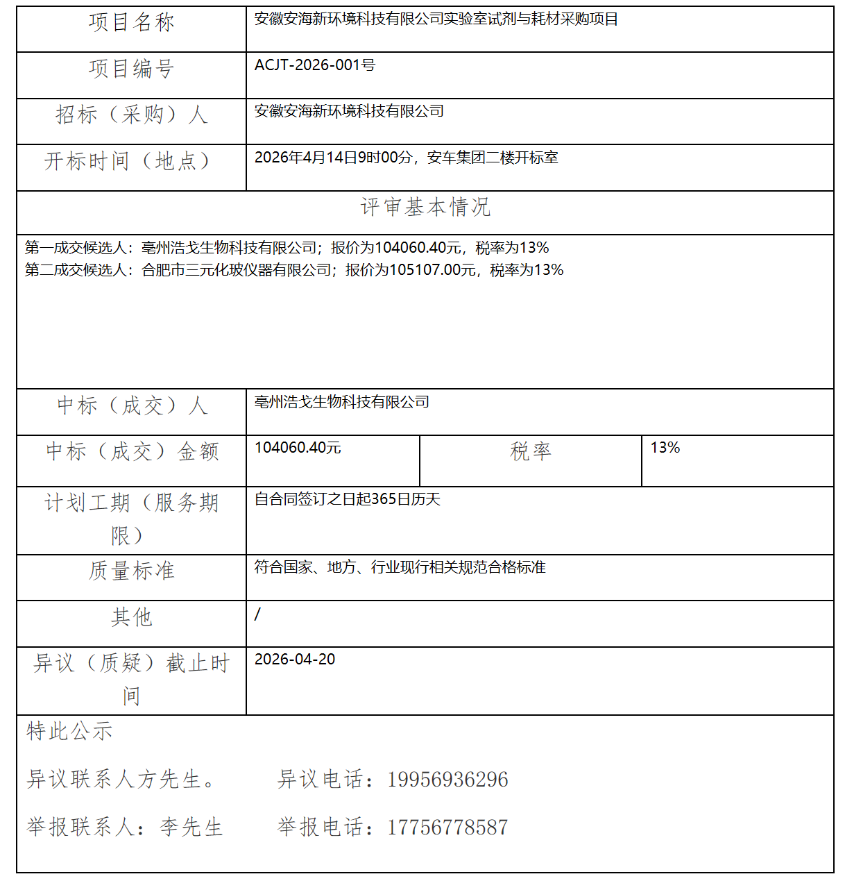 安徽安海新環(huán)境科技有限公司實(shí)驗(yàn)室試劑與耗材采購(gòu)項(xiàng)目中標(biāo)(成交)結(jié)果公示