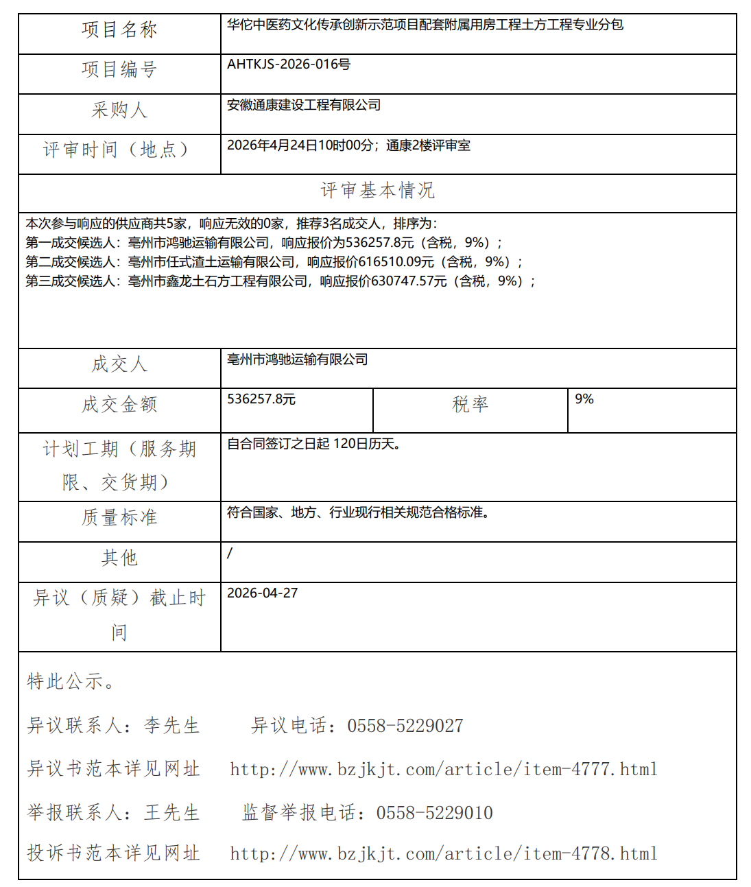 華佗中醫(yī)藥文化傳承創(chuàng)新示范項目配套附屬用房工程土方工程專業(yè)分包成交結(jié)果公示
