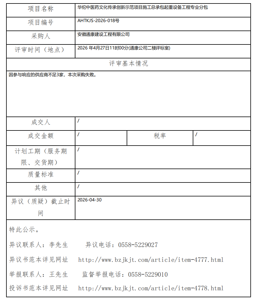 華佗中醫(yī)藥文化傳承創(chuàng)新示范項(xiàng)目施工總承包起重設(shè)備工程專業(yè)分包成交結(jié)果公示