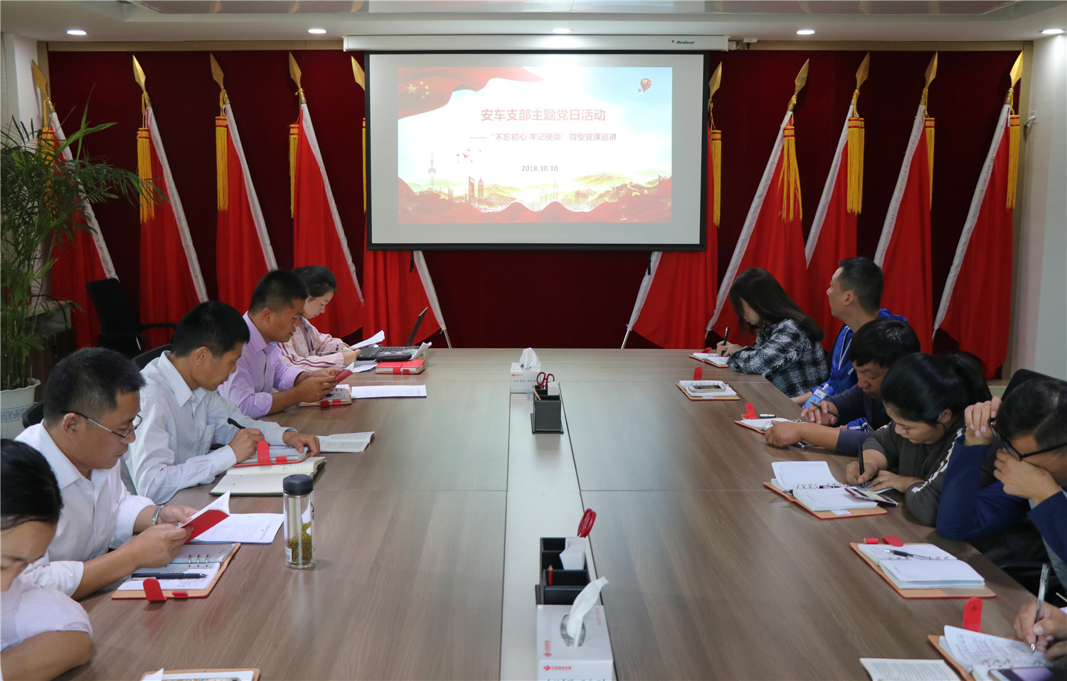 10月10日下午,安車交通黨支部在黨員活動室開展10月主題黨日活動,活動以“不忘初心 牢記使命”為主題講微型黨課的形式展開。支部組織委員張棟生主持會議,全體黨員、預(yù)備黨員參加會議。